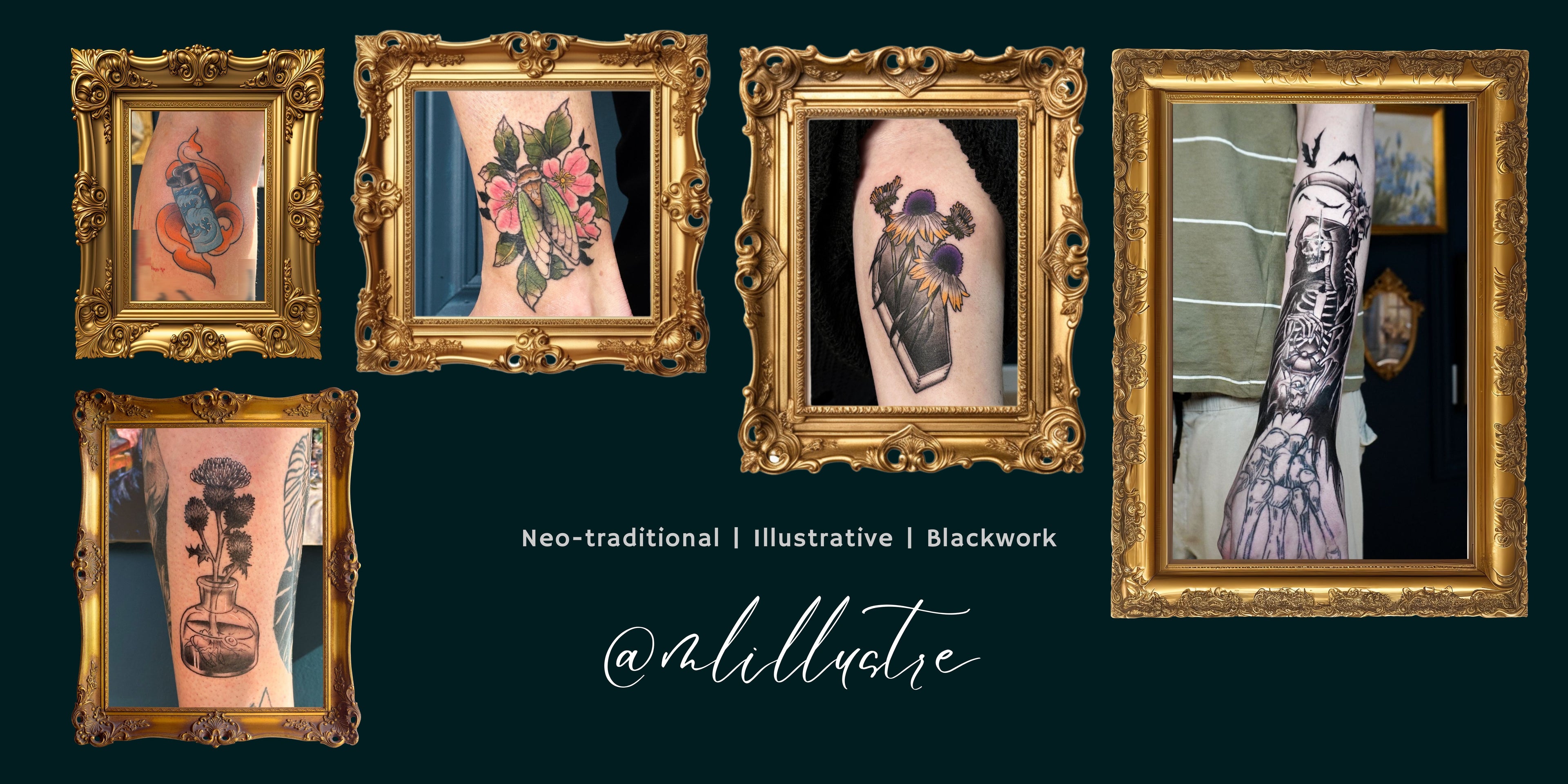 - I am specializing in neotraditional and dark illustrative styles, my work features bold lines, sharp contrasts, and a hint of darkness, inspired by spooky themes and unique visual elements.